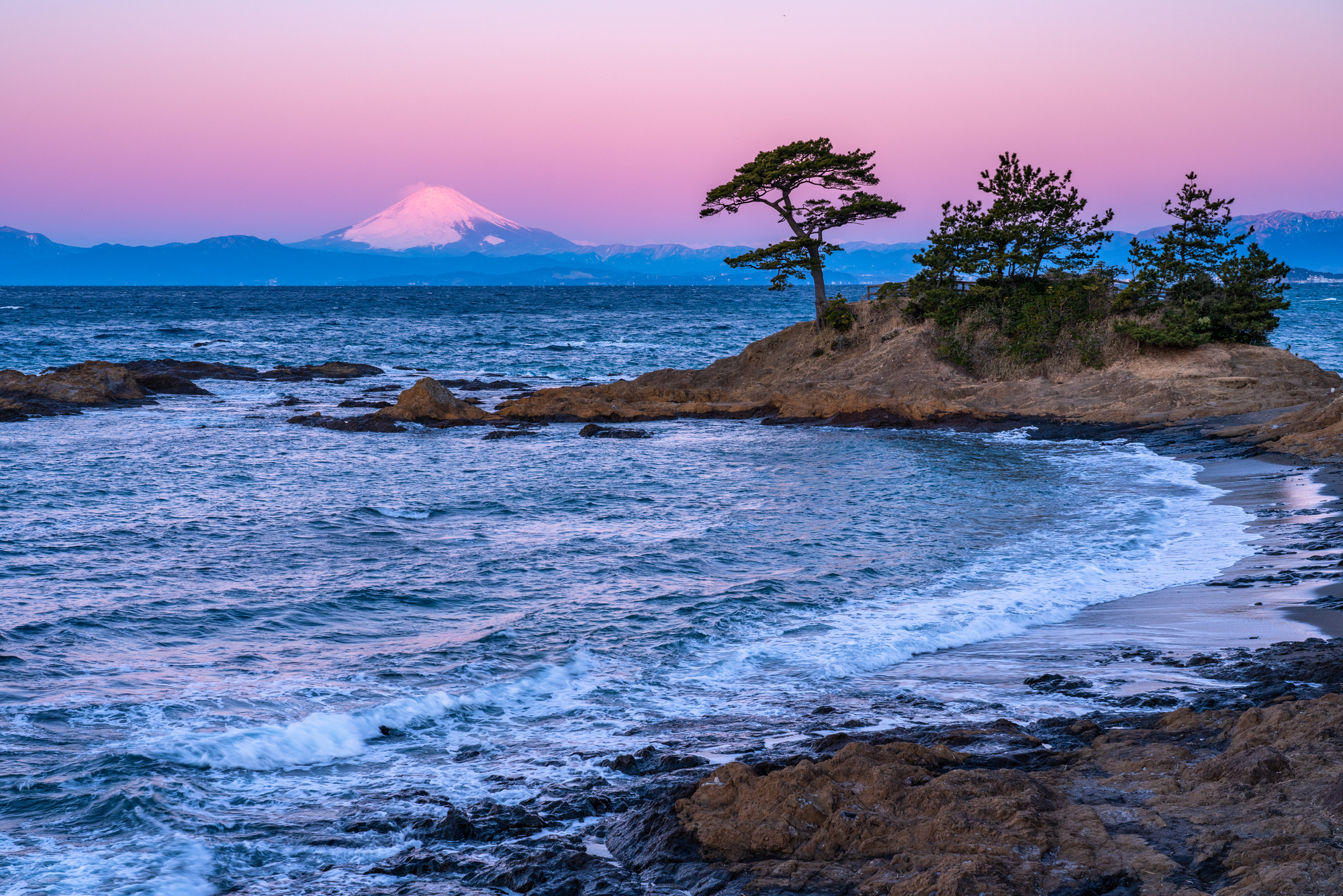 海岸に突き出た大きな奇岩「立石」をはじめ、美しい海岸の景色で知られています。 特に、富士山を背景にした「立石」の景色は、絶景のビューポイント!夕日が空を染める時刻がお勧めです。